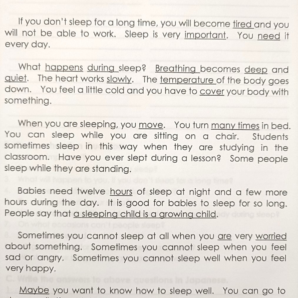まとまった英文を読み、内容について答えられるようになります。