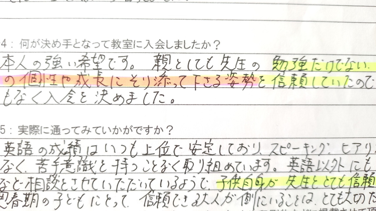 本人の強い希望です。親としても先生の勉強だけでない、子ども一人ひとりの個性や成長に寄り添って下さる姿勢に何の迷いもなく入会を決めました。