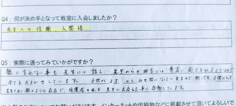 本人の強い希望です。親としても先生の勉強だけでない、子ども一人ひとりの個性や成長に寄り添って下さる姿勢に何の迷いもなく入会を決めました。